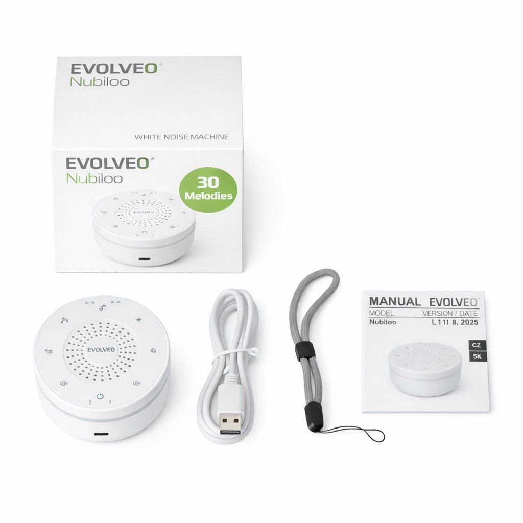 Imaginați-vă pace și liniște în dormitor în fiecare seară și copilul care se calmează în mod natural cu sunete familiare și lumină moale. Exact pentru asta este EVOLVEO Nubiloo - un ajutor mic, dar puternic la culcare. Acest lullaby inteligent combină sunetele de zgomot alb, cântece de leagăn și melodii naturale cu o lumină de noapte reglabilă. Dispozitivul nu numai că ajută la adormire, dar și la menținerea unui somn odihnitor în timpul nopții. Excelent pentru nou-născuți, copii mici, precum și pentru copiii mai mari și părinții obosiți. Utilizarea sa este simplă și intuitivă - pe noptieră, în cărucior și pe drum.