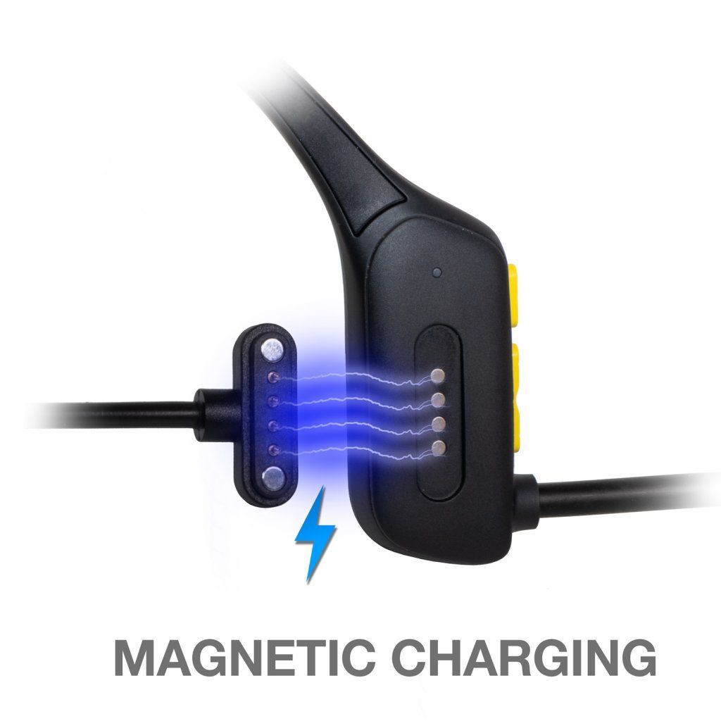 Căștile au un player MP3/WAV intern cu o capacitate de memorie de 8 GB, care vă permite să stocați până la 2000 de fișiere muzicale. Acest lucru înseamnă că vă puteți bucura pe deplin de muzică fără a fi nevoie să vă conectați la un alt dispozitiv. Cu o capacitate a bateriei de 180 mAh, puteți asculta muzică timp de până la 6 ore. Încărcarea este rapidă și ușoară datorită conectorului magnetic și a cablului de încărcare magnetic inclus. În plus, cablul vine cu un adaptor USB Type-C.
