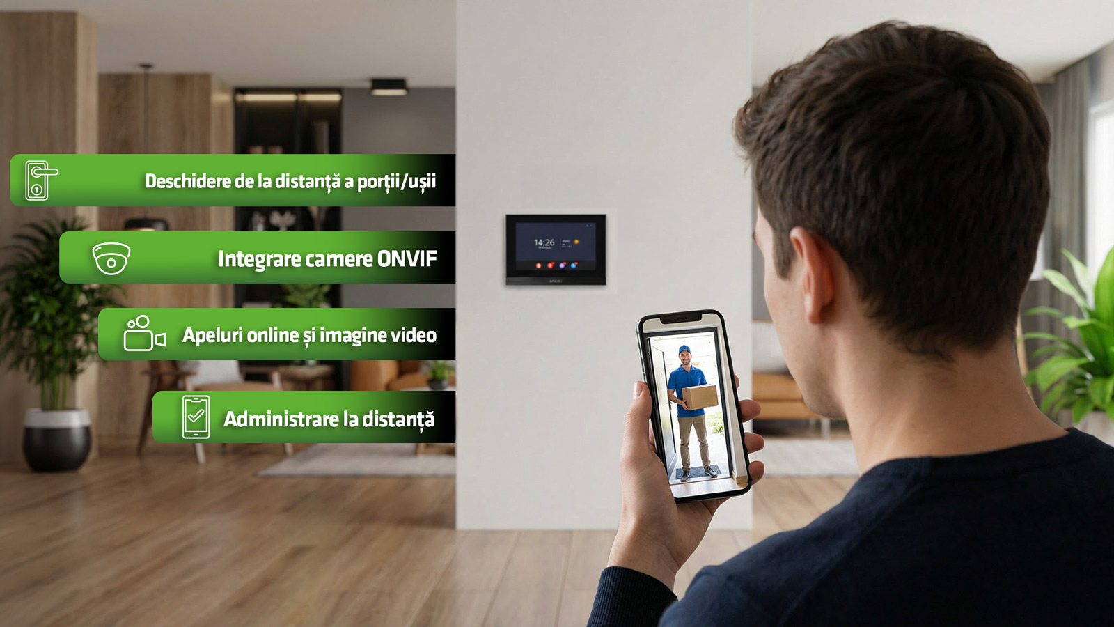 - Suport sistem: până la 4 monitoare, 2 unități exterioare, 2 camere IP