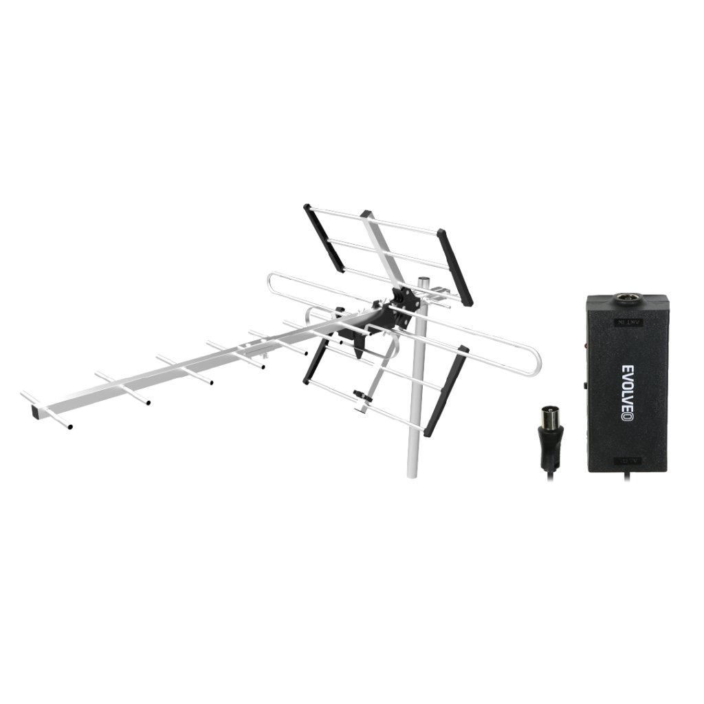 Antenă activă de exterior cu filtru LTE pentru recepția TV digitală și analogică, extinsă cu amplificator EVOLVEO AMP 1 cu filtru LTE. Pachetul include și suport pentru montarea antenei.