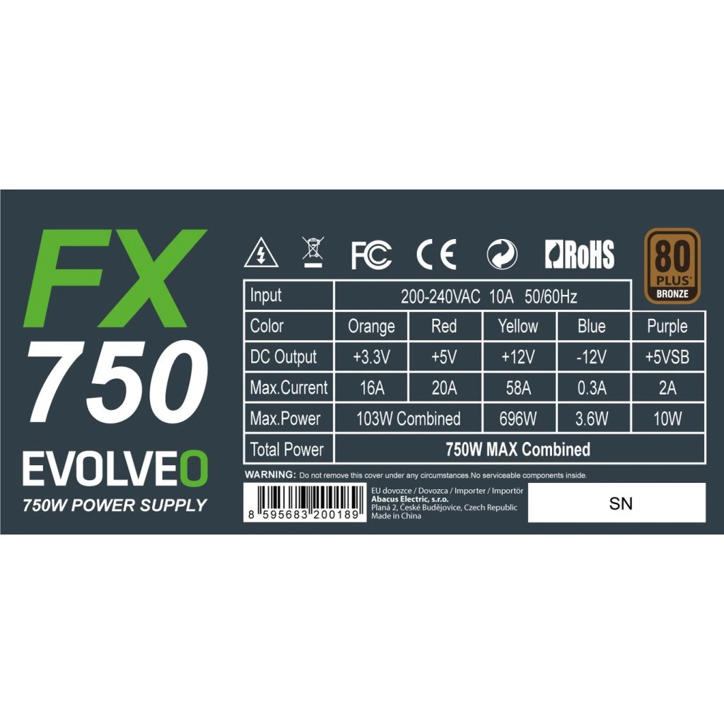 EVOLVEO FX 750, sursă de alimentare ATX de 750W, 14cm, silențios, 80+ Bronze, garanție 3 ani