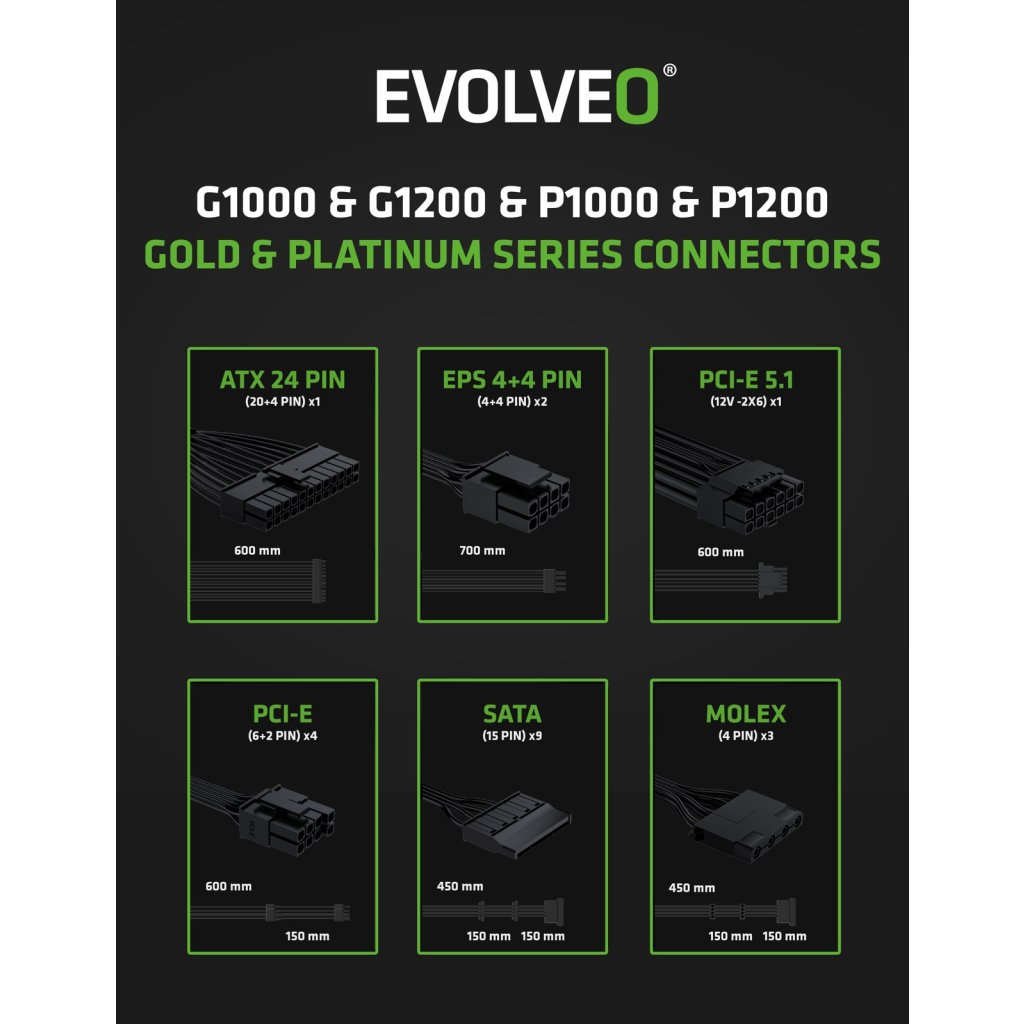 Uitați de cablurile încâlcite care împiedică fluxul de aer și mai strică și stilul carcasei dvs. de computer. Sursa EVOLVEO G1200-BK este complet modulară, astfel încât conectați la ea doar cablurile de care aveți cu adevărat nevoie. Pachetul include toate cablurile importante – un cablu ATX 24 PIN, două EPS 4+4 PIN, două PCI-E 6+2 PIN, un PCI-E 5.1 12V-2×6, trei SATA și un MOLEX. Astfel aveți spațiu pentru totul, de la CPU și GPU până la discuri și benzi LED sofisticate sau alte elemente suplimentare.