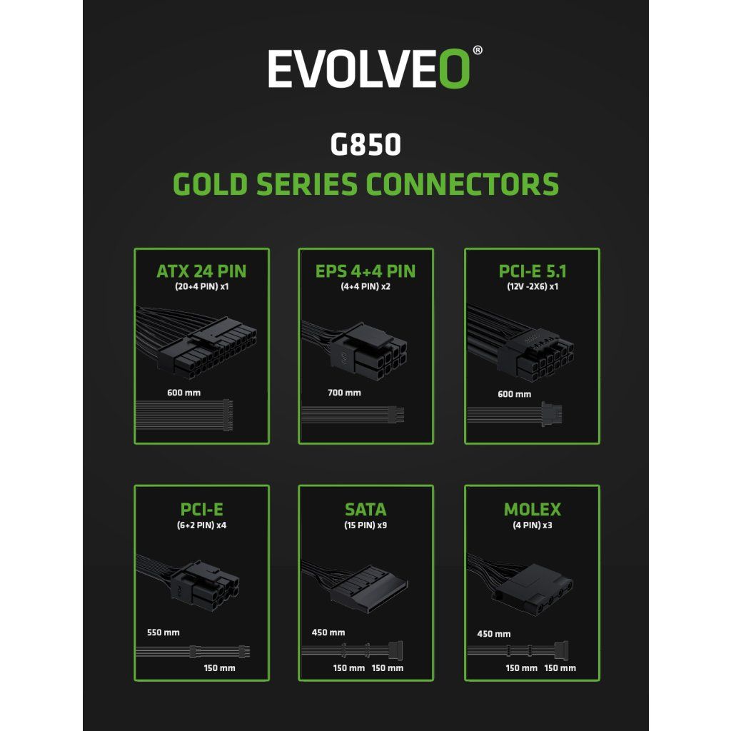 Uitați de cablurile încâlcite care împiedică fluxul de aer și mai strică și stilul carcasei dvs. de computer. Sursa EVOLVEO G850-WH este complet modulară, astfel încât conectați la ea doar cablurile de care aveți cu adevărat nevoie. Pachetul include toate cablurile importante – un cablu ATX 24 PIN, două EPS 4+4 PIN, două PCI-E 6+2 PIN, un PCI-E 5.1 12V-2×6, trei SATA și un MOLEX. Astfel aveți spațiu pentru totul, de la CPU și GPU până la discuri și benzi LED sofisticate sau alte elemente suplimentare.