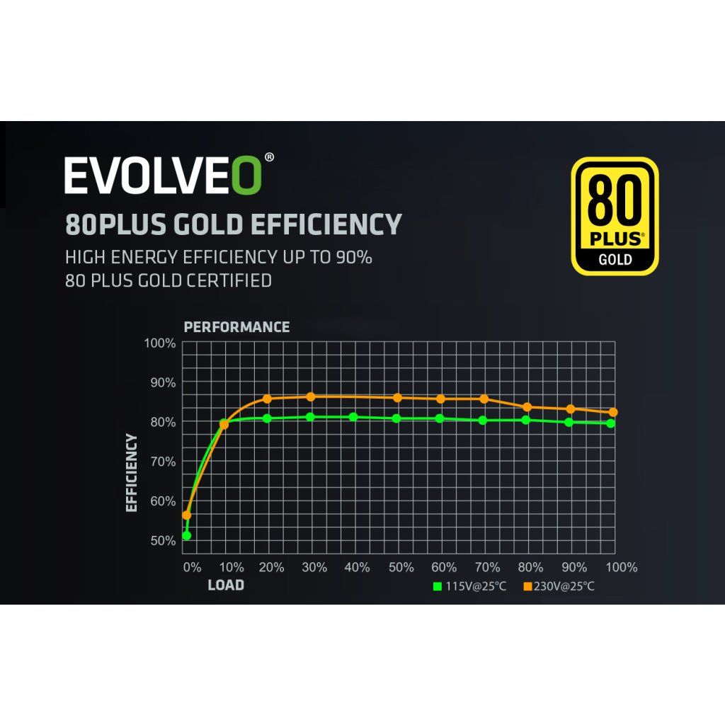 Sursa PC EVOLVEO G850-WH este mândrul deținător al certificării 80 PLUS Gold, care promite până la 92% eficiență (la sarcina obișnuită de 50%). Pierderile minime de energie și încălzirea redusă merg mână în mână cu funcționarea silențioasă a ventilatorului HDB de 140 mm – acesta are un strat special de ulei între ax și lagăre, iar frecarea sa este neglijabilă, astfel încât nivelul de zgomot rămâne la minimum. Cu această sursă, zgomotul ventilatorului nu vă deranjează – auziți doar șuieratul roților bolidului dvs. sau zângănitul armelor armatei dvs.