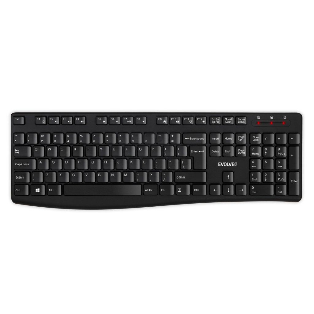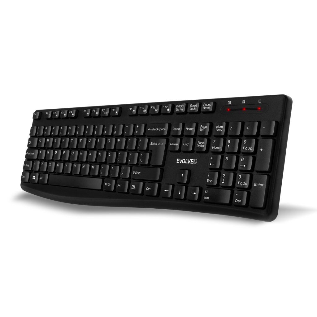 Tastatura care face parte din setul EVOLVEO K1050 conține 105 taste cu profil redus, distanțate clasic (cu o înălțime de 4,5 mm), datorită cărora funcționarea computerului este în întregime sub controlul dvs. Există o tastă mare Enter, amprente de caractere în limba engleză și un trio de indicatori LED utili (NumLock, CapsLock și baterie descărcată).