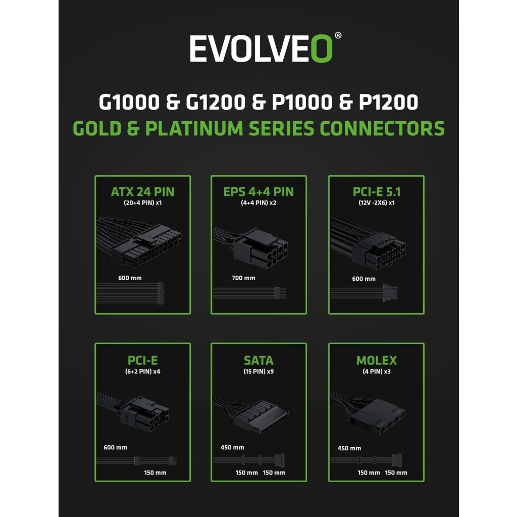 EVOLVEO P1000 sursă de alimentare 1000W, 80+ PLATINUM, ATX 3.1, aPFC, ventilator 140 mm, 3 ani garanție, negru
