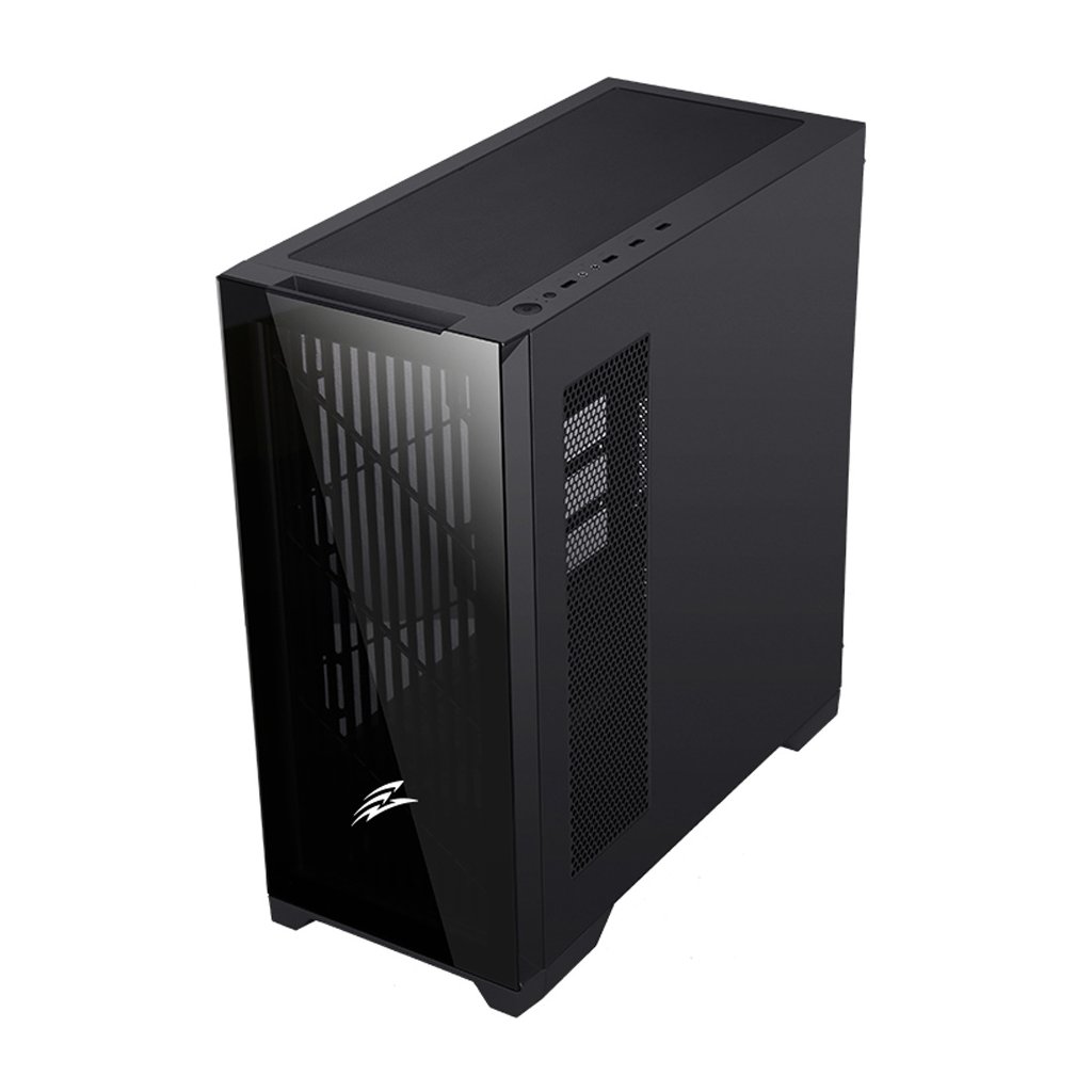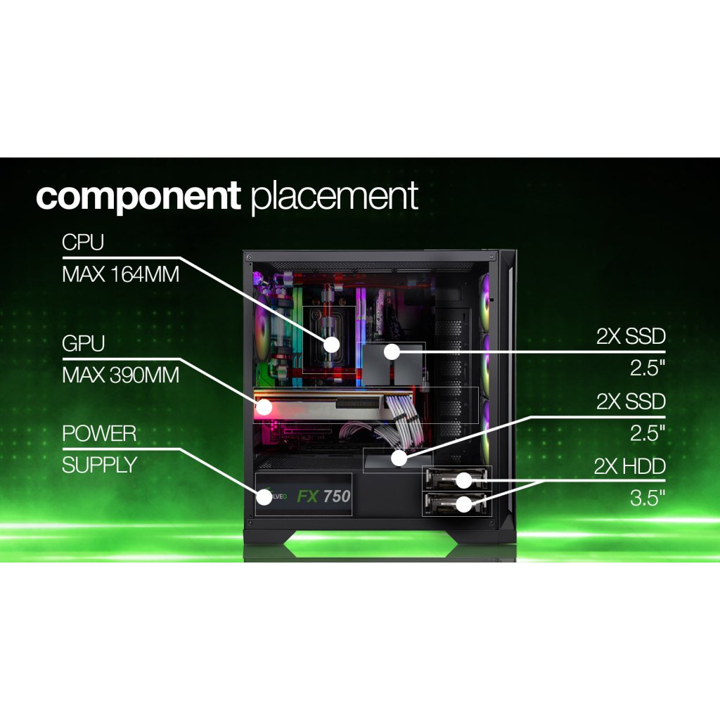 Lata stângă a carcasei pentru PC conține un perete lateral din sticlă călită. Carcasa este concepută pentru plăci de bază care acceptă atât platforme Intel, cât și AMD. Pe lângă formatul ATX, este compatibilă și cu formatele Micro ATX și Mini ITX. Sursa de alimentare este plasată în partea de jos a dulapului. Grila inferioară este dotată cu un filtru de praf extractibil, iar filtrul de praf superior este fixat cu ajutorul unor magneți și este detașabil.