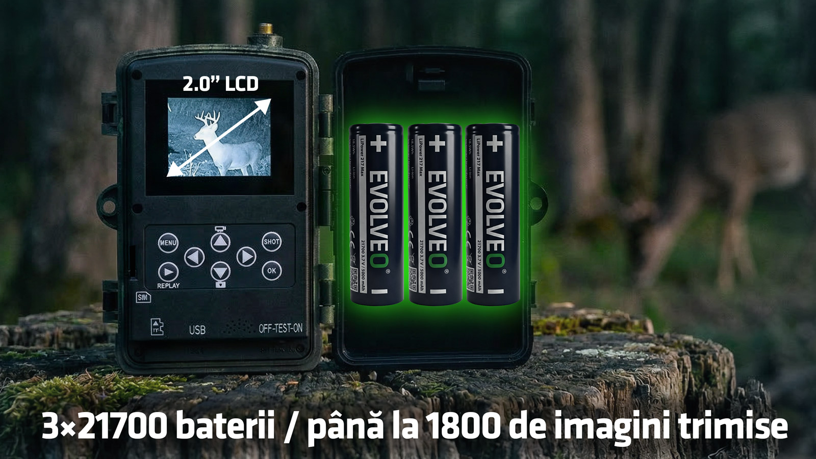 Cel mai mare avantaj al acestui model este alimentarea soluționată fără compromisuri. Camera utilizează 3 acumulatori Li-Ion 21700, care oferă o capacitate semnificativ mai mare decât bateriile obișnuite din această categorie. În practică, acest lucru înseamnă o funcționare considerabil mai lungă fără necesitatea unei intervenții, ideală pentru utilizarea pe termen lung în teren. În condiții optime, dispozitivul poate trimite până la 1500 de imagini la o singură încărcare, ceea ce reprezintă o diferență fundamentală față de modelele obișnuite. În plus, aveți posibilitatea de a înlocui simplu bateriile sau de a cumpăra altele suplimentare, astfel încât să puteți pregăti un set de rezervă și să continuați operarea în câteva secunde. În combinație cu alimentarea externă sau un panou solar, camera devine o soluție practic fără întreținere.
