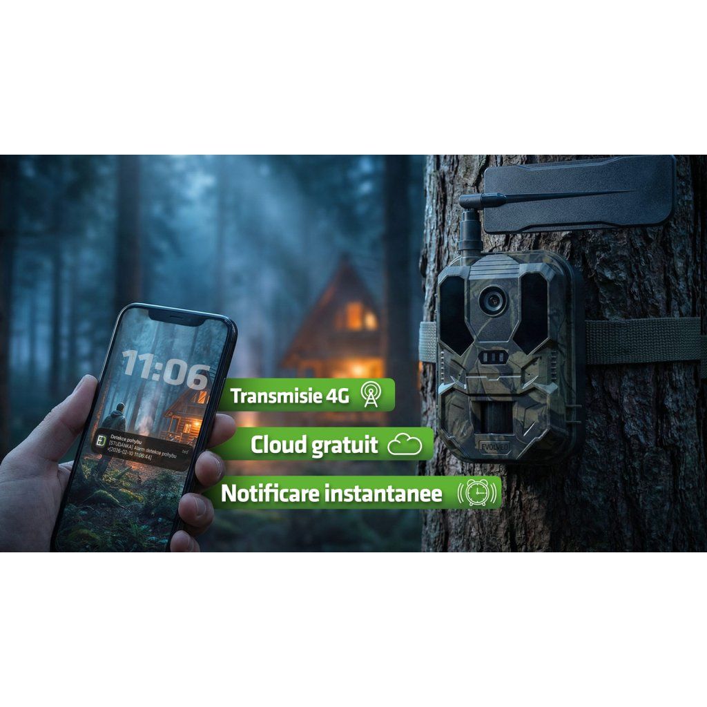 Adevărata putere a camerei de vânătoare EVOLVEO StrongVision PRO 4G II se dezvăluie pe deplin atunci când este asociată cu aplicația mobilă EVOLVEO CAM. Aceasta servește ca un centru central de control și prezentare generală, de unde aveți întotdeauna dispozitivul sub control – fie că sunteți acasă, la serviciu sau în cealaltă parte a țării. Camera de vânătoare trimite automat fotografiile și videoclipurile capturate în stocarea cloud, unde sunt accesibile în siguranță de oriunde, și puteți alege, de asemenea, să le trimiteți pe e-mail sau pe server FTP conform preferințelor dvs. În aplicație, puteți răsfoi cu ușurință istoricul înregistrărilor, verificați starea bateriei, puterea semnalului sau capacitatea cardului de memorie și puteți ajusta setările dispozitivului oricând, fără a avea nevoie de acces fizic la camera de vânătoare. Totul funcționează intuitiv, clar și cu accent pe fiabilitate – exact așa cum ar trebui să funcționeze o cameră de vânătoare 4G modernă.