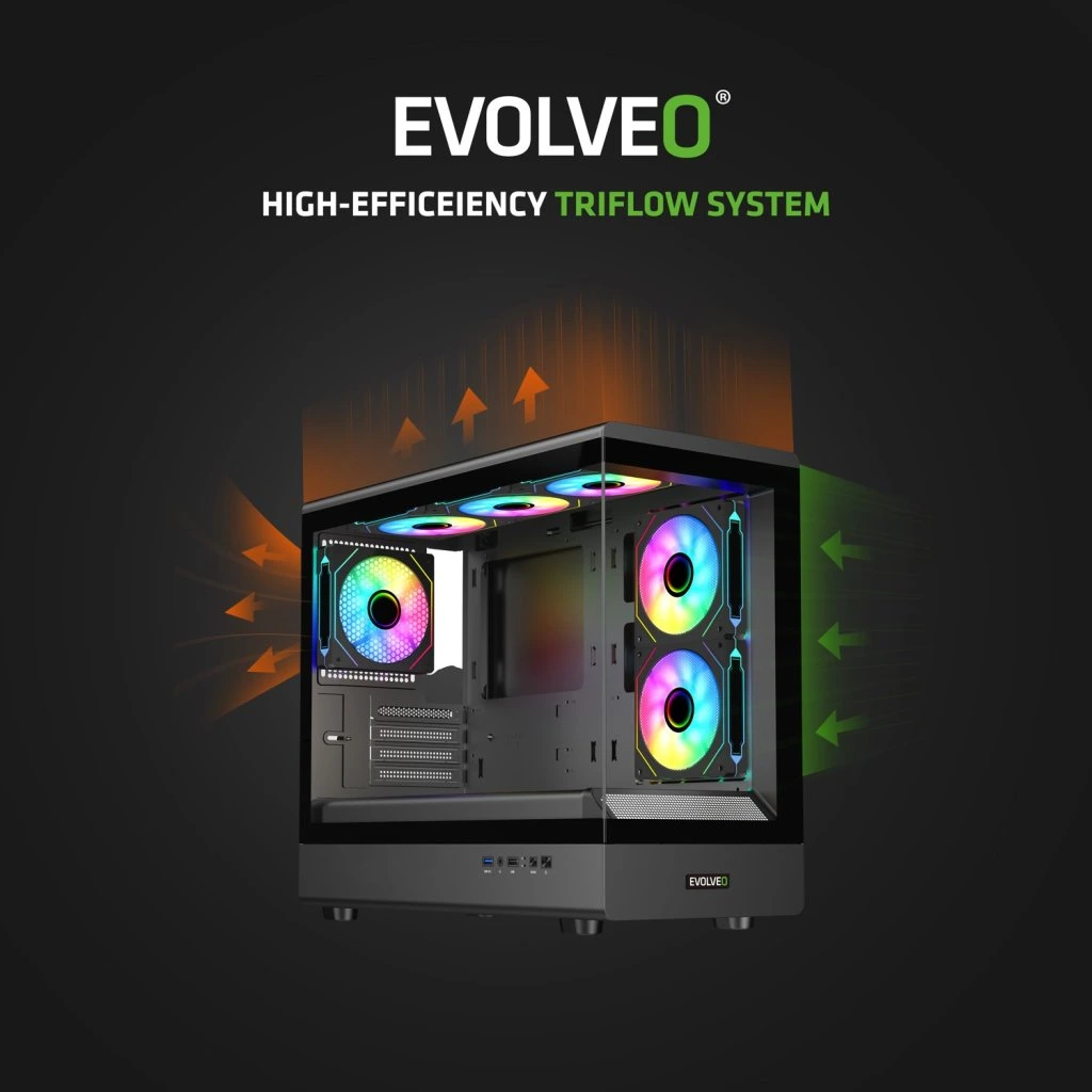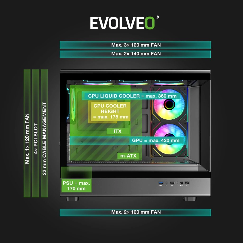 EVOLVEO Ursus, carcasă mATX, 6x ventilator ARGB 120mm, panou lateral + frontal din sticlă