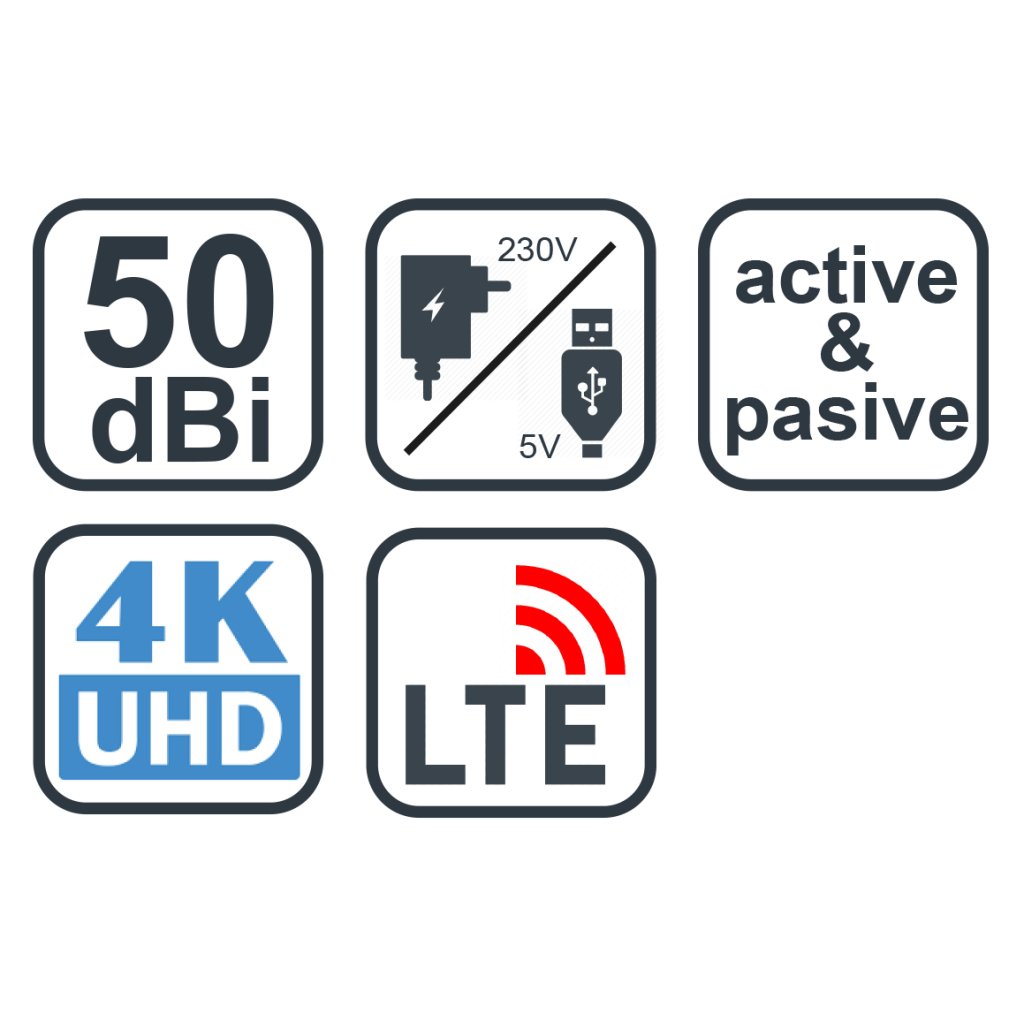 antenă pentru interior, de 50dBi, pentru recepția TV digitală și analogică a semnalului DAB+/DVB-T2, filtru LTE, 4G, 5G
